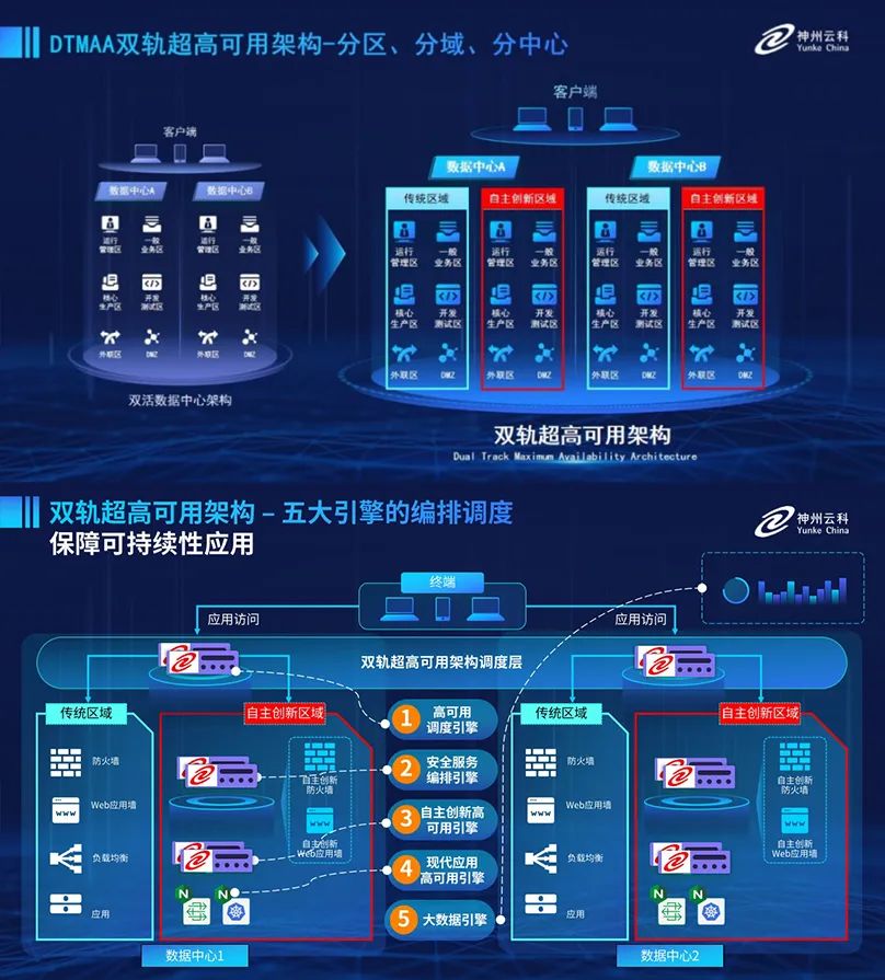 為助力銀行業(yè)務(wù)高質(zhì)量發(fā)展,更好地應(yīng)對數(shù)字經(jīng)濟(jì)時代對可持續(xù)性的高要求,實(shí)現(xiàn)“信創(chuàng)”與“數(shù)字化”齊頭并進(jìn),leyu.樂魚創(chuàng)新性的推出了雙軌超高可用架構(gòu)。該架構(gòu)在雙活數(shù)據(jù)中心的分區(qū)調(diào)度基礎(chǔ)上,增加信創(chuàng)域和非信創(chuàng)域的分域調(diào)度,實(shí)行信創(chuàng)域與傳統(tǒng)域應(yīng)用全量部署,使雙中心運(yùn)營變?yōu)殡p中心四區(qū)域并行運(yùn)行,互為多活,將“0到1”的單軌建設(shè)道路變?yōu)榉謪^(qū)分域協(xié)同的多活雙軌超高可用架構(gòu)。幫助客戶在新架構(gòu)下,保障“信創(chuàng)”的同時解決性能瓶頸,提升穩(wěn)定性,保證應(yīng)用可持續(xù)性,最終實(shí)現(xiàn)信創(chuàng)區(qū)域和非信創(chuàng)區(qū)域的平滑過渡,完成國產(chǎn)化替代目標(biāo)。
